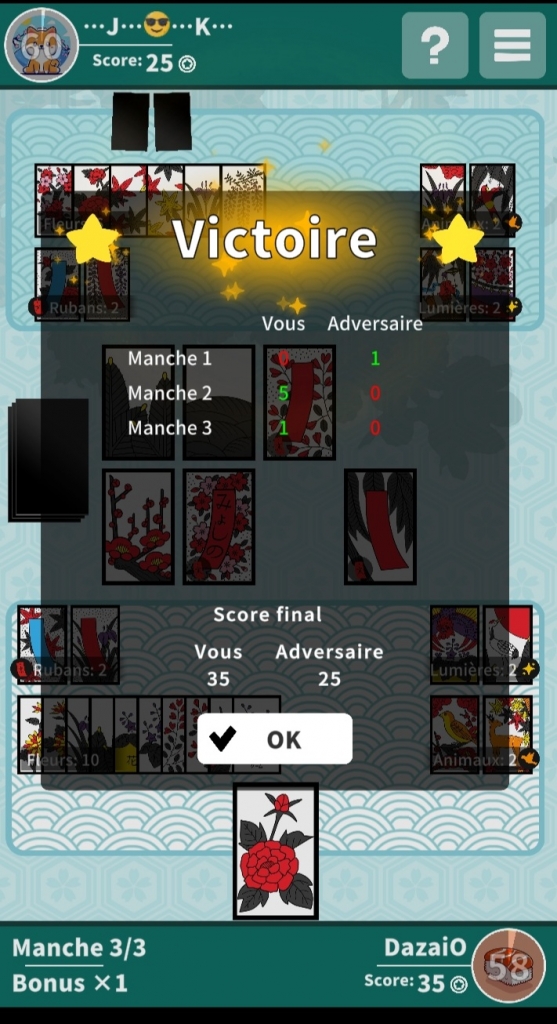 Ma 1.313e victoire, ce fut donc, juste après, face à ···J···K···, un habitué de l’appli. — Manche 1 gagnée par lui, 1 point avec les 10 fleurs. J’ai eu chaud car le hasard aurait pu lui faire marquer les deux sakés, mais il n’a jamais récupéré la carte maîtresse, alors qu’un des deux chrysanthèmes était dans la rivière depuis le début, ou presque (ma mémoire me fait défaut ici). — Manche 2 gagnée à la 4e carte, avec saké sous les cerisiers : j’ai déclaré yame, car, l’adversaire ayant déjà 3 lumières, je n’avais guère d’espoir de marquer davantage. — Manche 3 gagnée à l’avant-dernière prise, au terme d’une classique « course aux fleurs ».