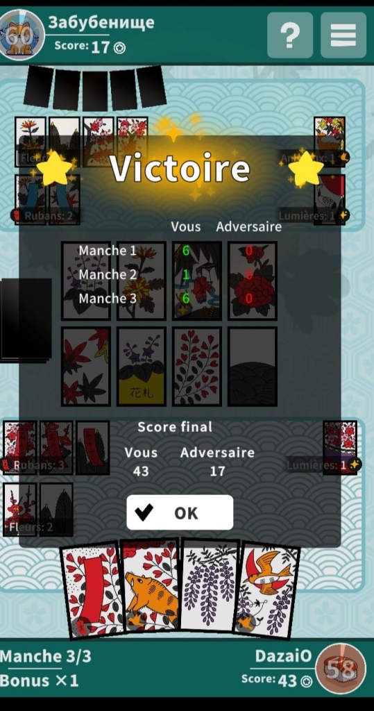 Je joue contre un·e Russe, oya, qui prend d’emblée le rideau de cerisier. Je riposte avec la grue, le ruban bleu assorti du cerf (à la pioche). Iel prend le sanglier, moi les papillons avec le ruban bleu de pivoine.